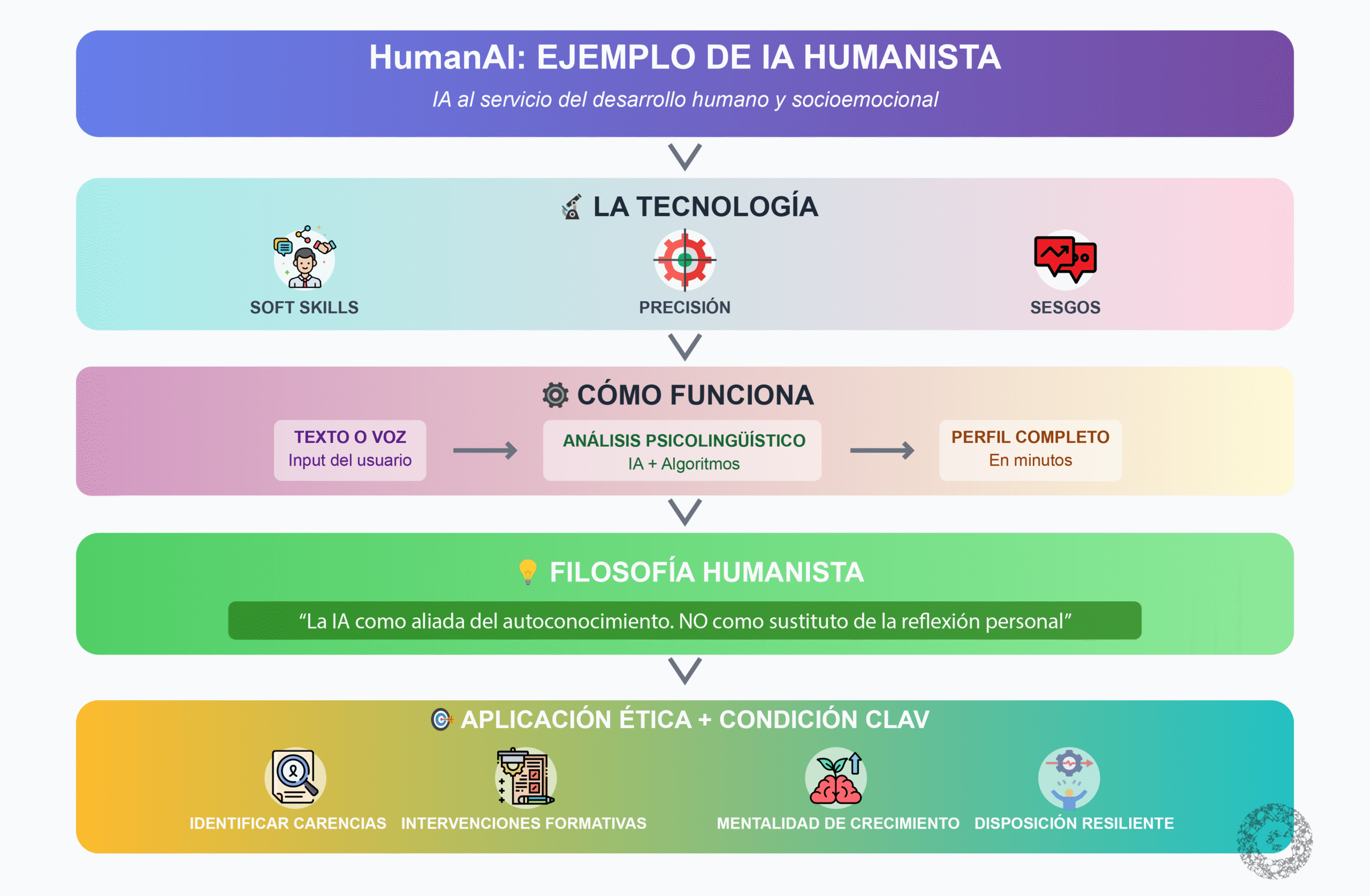 Existen ya iniciativas prometedoras que ejemplifican este acercamiento humanista a la IA. Por ejemplo, el proyecto HumanAI desarrolla una plataforma que, mediante inteligencia artificial y análisis psicolingüístico, genera en minutos un perfil de 35 soft skills o competencias socioemocionales de una persona a partir de un texto o grabación de voz (HumanAI, s.f.). Con una precisión reportada de ~85% y evitando sesgos de autopercepción propios de tests tradicionales, esta herramienta pone “la inteligencia artificial al servicio del desarrollo humano y de la sociedad” (HumanAI, s.f.). Si bien es una aplicación tecnológica, su objetivo es intrínsecamente humano: conocer mejor las habilidades socioemocionales de individuos y equipos para poder potenciarlas. La IA actúa aquí como aliada del autoconocimiento, no como sustituto de la reflexión personal. Iniciativas así, aplicadas éticamente, podrían ayudar a identificar carencias en empatía, autocontrol o pensamiento crítico en estudiantes y docentes, orientando intervenciones formativas tempranas. No obstante, para que su uso sea enriquecedor, los usuarios deben tener la disposición resiliente de aprender de sí mismos y mejorar –lo cual nos remite de nuevo a la importancia de la mentalidad de crecimiento y la generatividad.