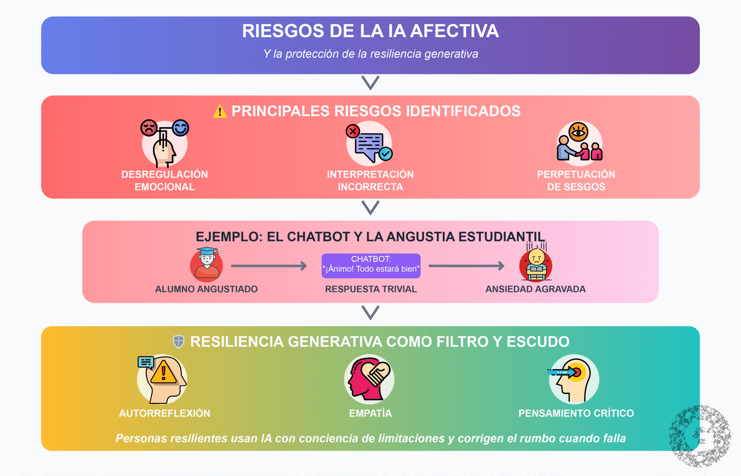 Otro riesgo identificado es la desregulación emocional: si las IA afectivas no interpretan correctamente las señales humanas, pueden responder de manera inadecuada y agravar el estado del usuario (OEI, 2024). Por ejemplo, un chatbot que no reconozca el aumento de angustia en un alumno podría dar una respuesta trivial que empeore su ansiedad. Sin la guía de una resiliencia humana, la tecnología carece de juicio contextual y puede amplificar emociones negativas o sesgos presentes en sus datos. De hecho, la IA generativa tiende a reflejar patrones generales de sus enormes bases de datos, lo cual sin control crítico puede perpetuar sesgos y desigualdades en las relaciones (OEI, 2024). Por tanto, la resiliencia generativa actúa como un filtro y escudo: personas con capacidad de autorreflexión, empatía y pensamiento crítico podrán utilizar la IA con conciencia de sus limitaciones, regulando su propio uso y corrigiendo el rumbo cuando la tecnología falle a nivel humano.