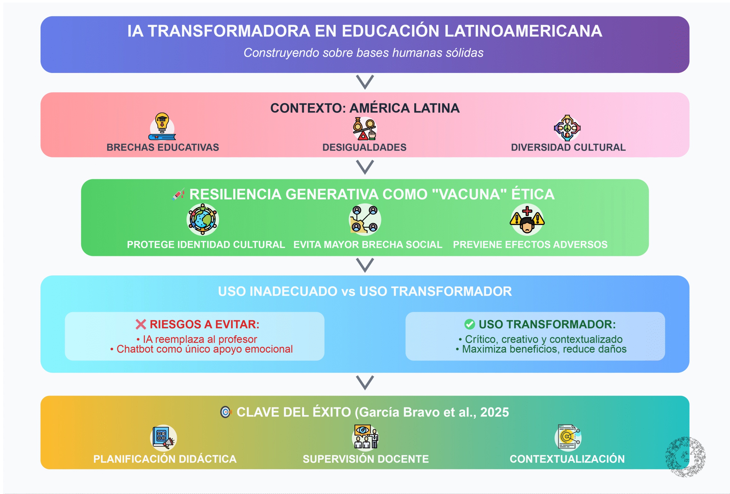 En América Latina, donde coexisten brechas educativas, desigualdades sociales y gran diversidad cultural, es especialmente importante que la transformación digital se construya sobre bases humanas sólidas. Los esfuerzos regionales –como el mencionado diálogo de la OEI (2024)– subrayan la necesidad de alinear la IA con el florecimiento humano y el bienestar emocional. Esto implica formar docentes, estudiantes y tomadores de decisión que posean la resiliencia generativa necesaria para que la tecnología se incorpore sin violar la identidad cultural ni agrandar la brecha social (OEI, 2024). La resiliencia generativa funcionaría así como una “vacuna” ética y emocional frente a potenciales efectos adversos de la IA en contextos vulnerables: por ejemplo, evitaría que en escuelas con carencias la IA reemplace al profesor (deshumanizando el aprendizaje) o que en comunidades expuestas a violencia los jóvenes vean en un chatbot su único apoyo emocional (generando dependencia). En lugar de ello, la resiliencia generativa promovería un uso crítico, creativo y contextualizado de la IA, maximizando sus beneficios y reduciendo sus daños.