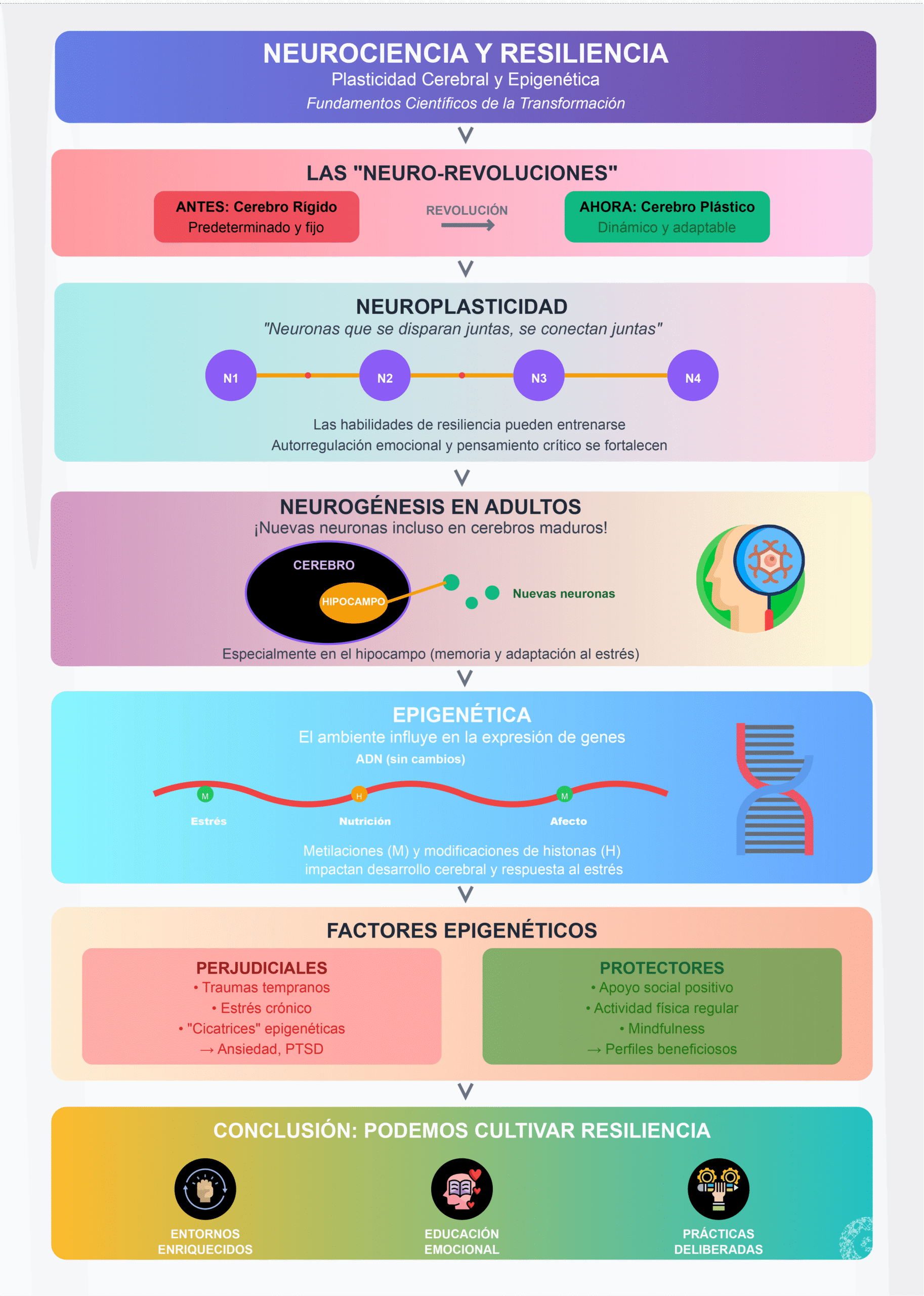 Los avances en neurociencia de las últimas décadas proporcionan un soporte empírico a este concepto de resiliencia transformadora. Varias “neuro-revoluciones” —en palabras de Grané y Forés (2019)— han refrendado que el cerebro humano es un órgano plástico, dinámico y capaz de reconfigurarse a lo largo de la vida. Uno de los hallazgos clave es la neuroplasticidad, la capacidad de las neuronas para formar nuevas conexiones y circuitos en respuesta a las experiencias. La máxima neurocientífica “neuronas que se disparan juntas, se conectan juntas” refleja cómo los patrones de pensamiento y comportamiento repetidos moldean físicamente el cerebro. Esto significa que habilidades asociadas a la resiliencia –por ejemplo, la autorregulación emocional o el pensamiento crítico– pueden entrenarse y fortalecerse mediante la práctica y la experiencia, modificando las redes neuronales involucradas (Davidson & McEwen, 2012, citado en Grané & Forés, 2019). Igualmente relevante es la neurogénesis descubierta en adultos: incluso en cerebros maduros se generan neuronas nuevas, especialmente en el hipocampo, área crucial para la memoria y la adaptación al estrés. Estos descubrimientos desmontan la noción de un cerebro rígido y predeterminado, sugiriendo en cambio un órgano que aprende continuamente y se adapta, base biológica de la resiliencia.