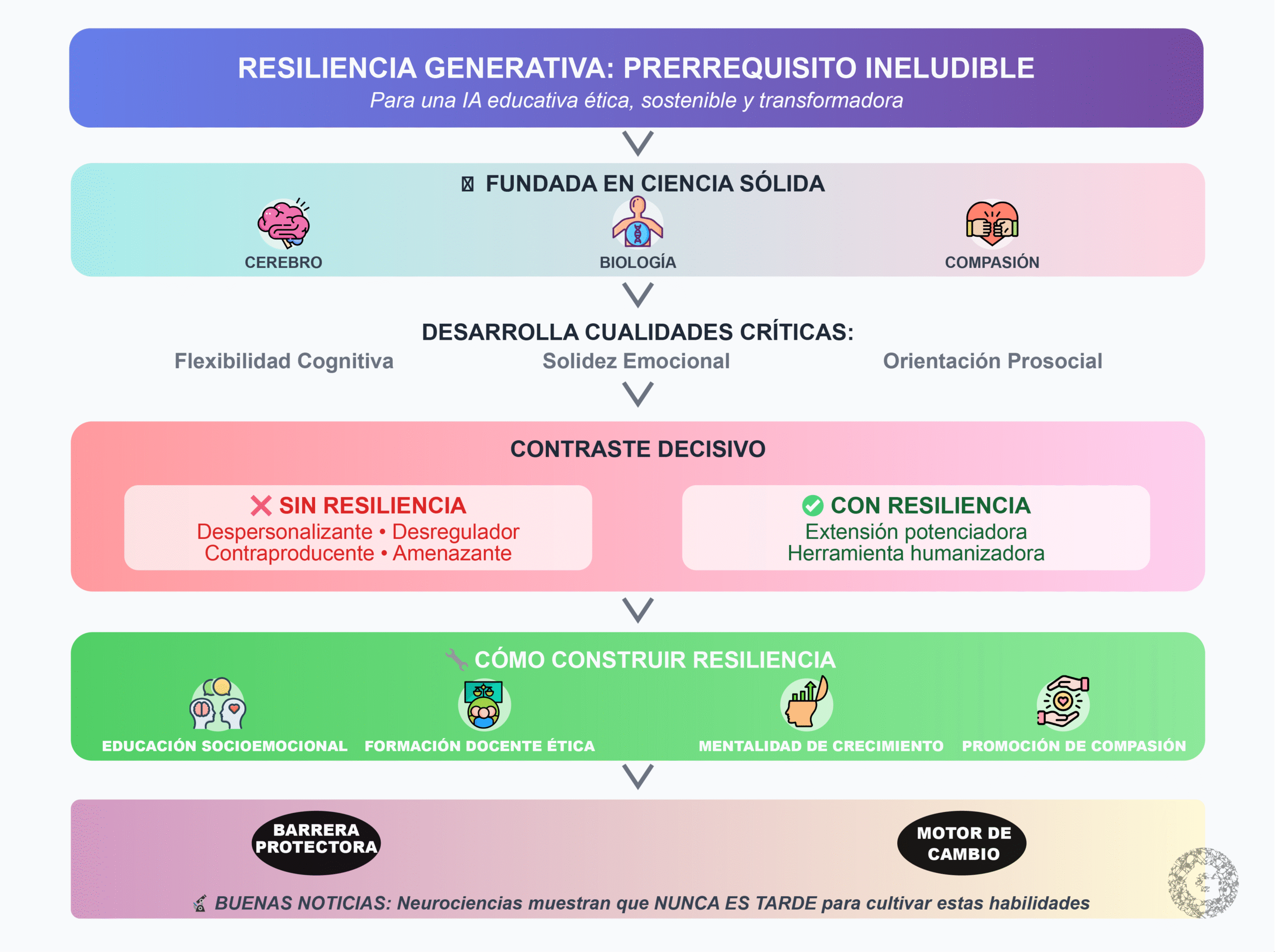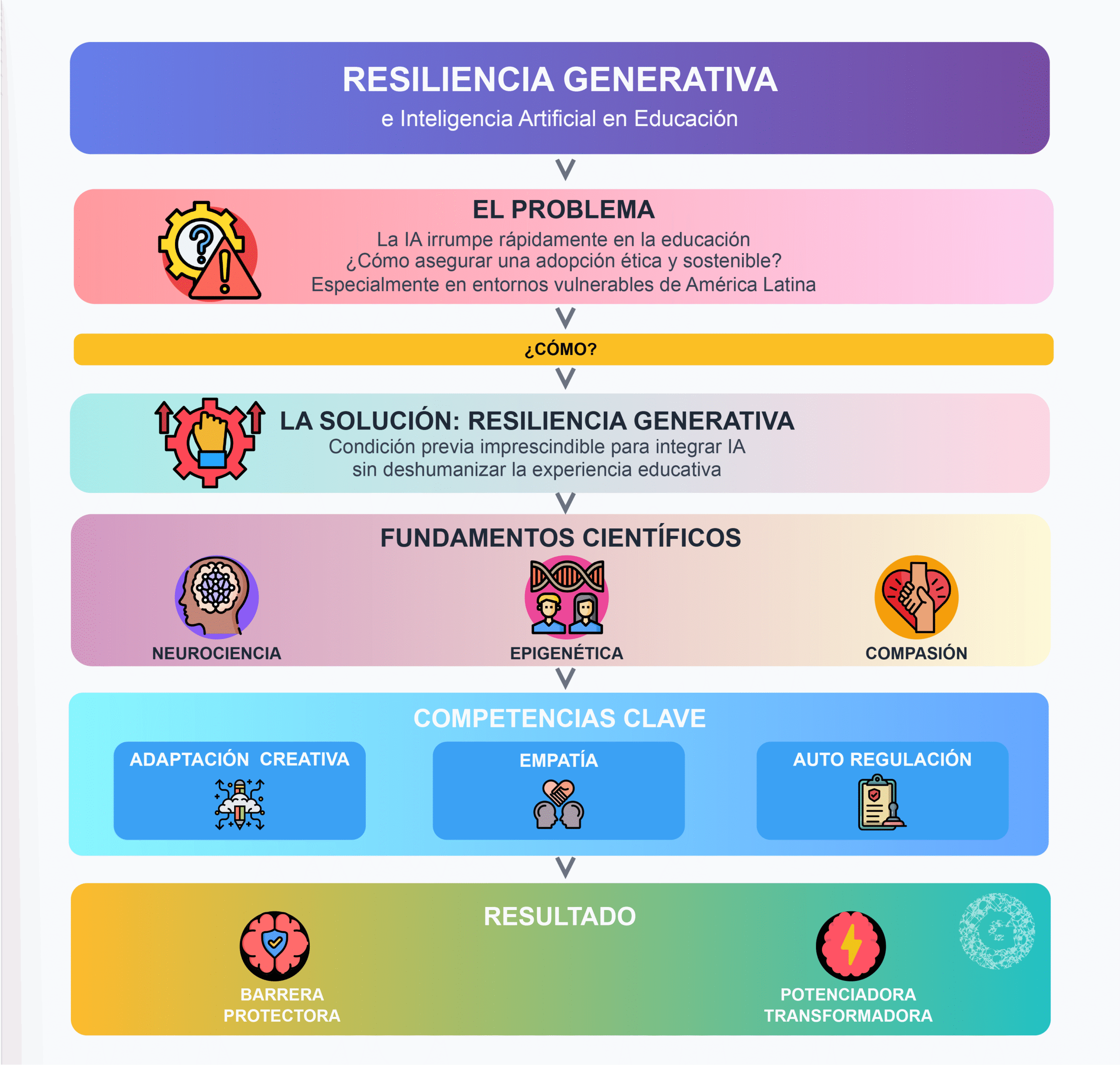 La rápida irrupción de la inteligencia artificial (IA) en la educación plantea interrogantes sobre cómo asegurar que su adopción sea ética, sostenible y potencie el desarrollo humano. Este artículo sostiene que la resiliencia generativa –un concepto fundamentado en hallazgos de la neurociencia, la epigenética y el entrenamiento de la compasión– es una condición previa imprescindible para lograr una integración de la IA que promueva competencias valiosas sin deshumanizar la experiencia educativa. En otras palabras, antes de desplegar plenamente la IA en contextos educativos, especialmente en entornos vulnerables de América Latina, debemos fortalecer en las personas la capacidad de adaptación creativa, la empatía y la autorregulación que caracterizan a la resiliencia generativa. A continuación, se define este concepto y se exploran sus fundamentos científicos recientes, para finalmente discutir cómo funge como barrera protectora y potenciadora de un uso transformador de la IA en educación.